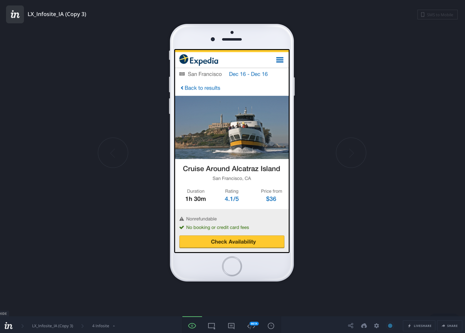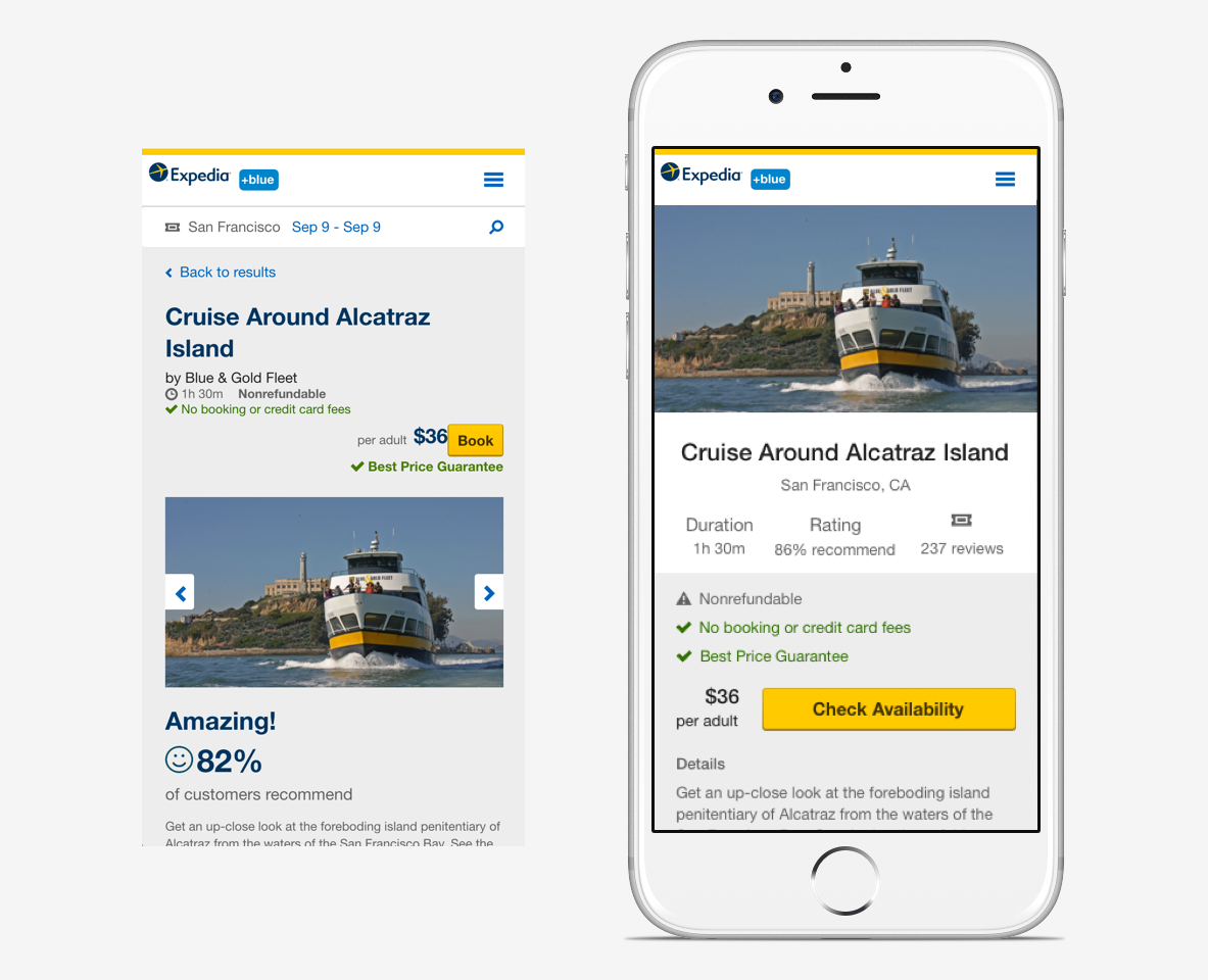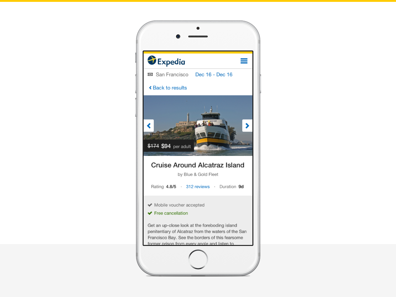 At Expedia, I redesigned the information architecture of the Activities shopping path, including the search results page and activity information page, using mixed-methods research to inform my design. This was a self-intiated project, which I conducted over several months in my "extra" time at work. I designed and conducted a research program to inform my work, consisting of ethnographic interviews, competitive analysis, and a Kano study, as well as usability studies of prototypes along the way.