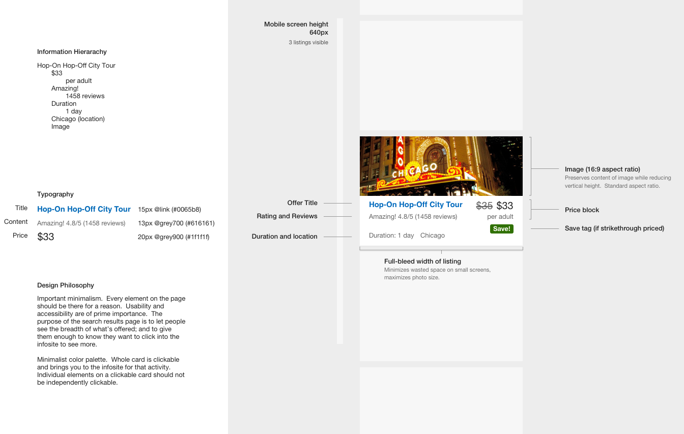 Following the usability study, changes were made to the interface to address problems that came up, while retaining the key design features of keeping large, immersive imagery, and the high level filter information (rating, duration, and price) prominently featured near the top.