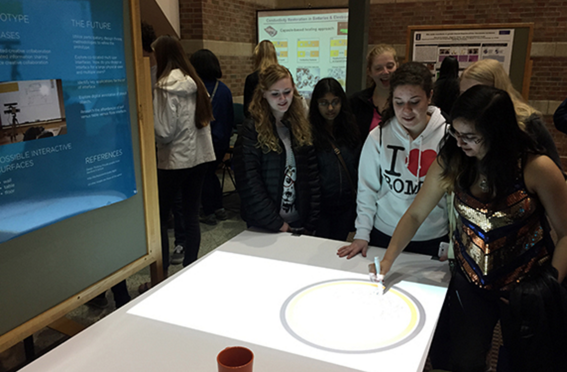 Informal user studies were conducted in the form of playful demos, often in public spaces, such as the Beckman Open House at the University of Illinois. The goal was to encourage creativity and play as a way to explore the design possibilities of large multitouch displays. The prototype system would be set up in either a wall or table setup, and users would be encouraged to play around with the system. I would explain the basic setup, including that you need to use the pen, and then ask them to have a go with it. We stressed to users that there are no "right" or "wrong" ways to use it, and encouraged them to think out loud. After the users had some time to play around, I would ask them, "now what do you think we can do to improve it?". Most users would give some feedback based on their brief experience, but some would spend a significant time thinking about it.