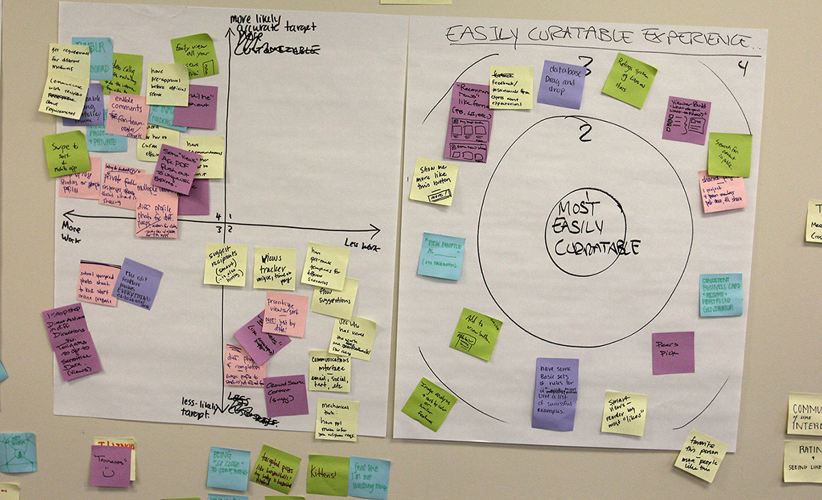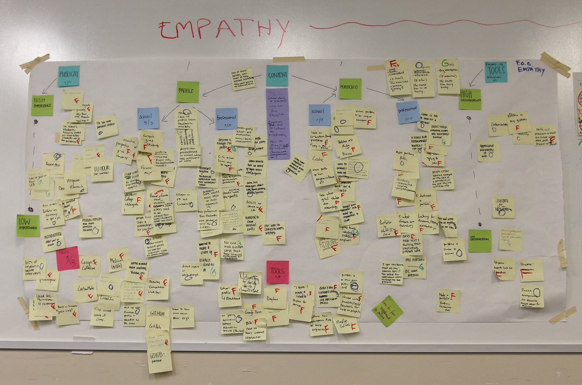 We began by talking with prospective users of our product to gain a sense of empathy for who they are and what they are trying to do, writing one statement, observation, or thought on its own sticky note, and placed them on the wall. Then we began to group the notes by concepts.